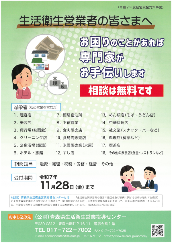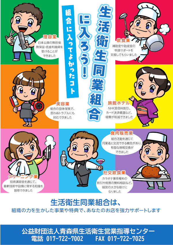 公益財団法人青森県生活衛生営業指導センターは、「生活衛生関係営業の運営の適正化及び振興に関する法律(略称:生衛法)」に基づき設置された機関です。 生衛業を営んでいる方、これから生衛業を営もうとする方のために次のような業務を行っています。お気軽にご利用ください。