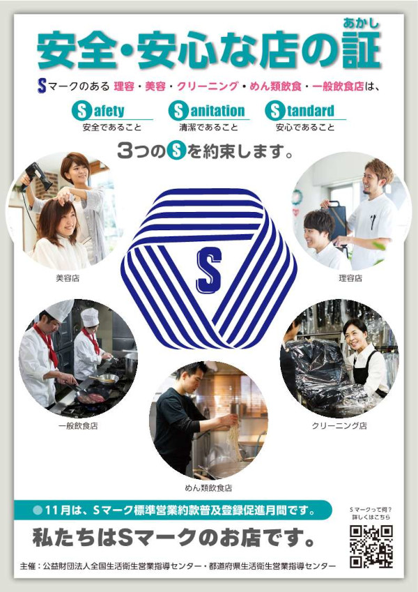 | 標準営業約款登録 | 理容・美容業、クリーニング業、一般飲食業、めん類業を対象に、消費者の「お店選びの目安」として、厚生労働大臣認可のSマーク(標準営業約款)の登録を行っています。 |