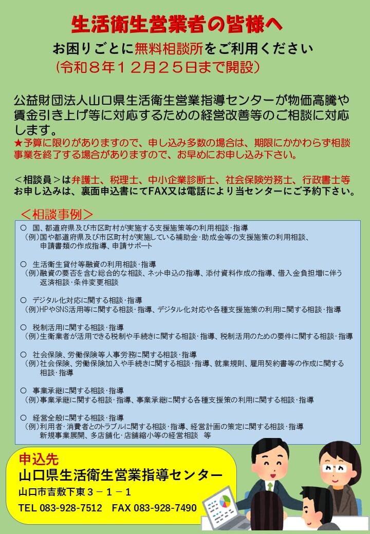 山口県生活衛生営業指導センターでは物価の高騰や賃金引き上げ、エネルギー関連等で影響を受ける生衛業者の皆様からの幅広い相談に対応するため、無料での専門相談窓口を当指導センターに開設しています。